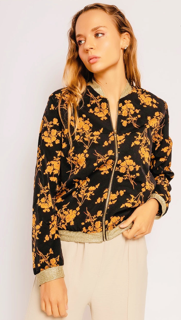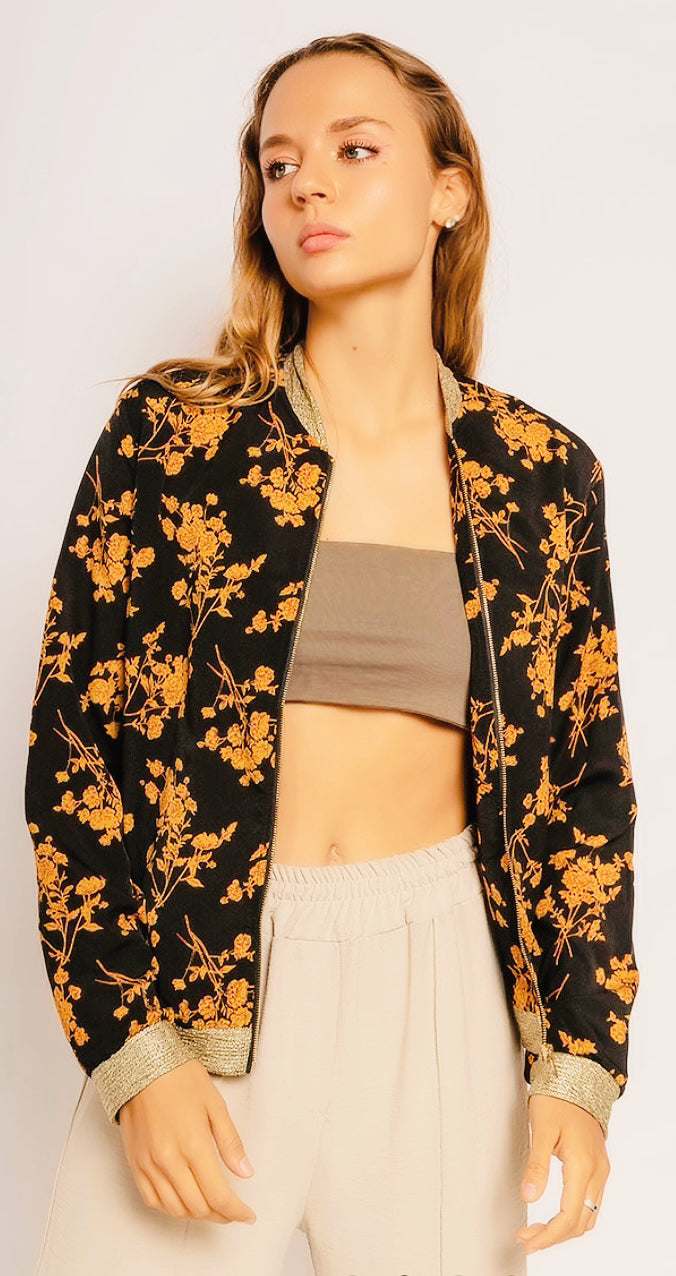 The exquisite and exotic Everleigh ensemble reveals a mustard floral bomber jacket in an elegant black shade edged with metallic gold. The bombers are designed and devised by artisans in printed Georgette promising an ideal match with your favorite jeans.
