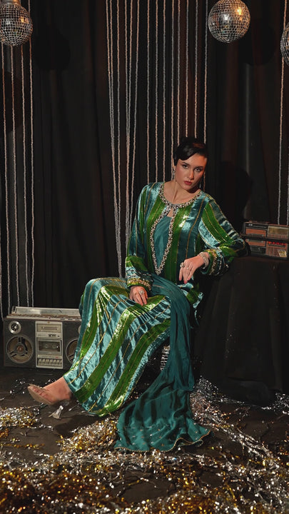 Refined and radiant, Fete Emerald is a formal velvet ensemble designed for elevated evenings. The pure velvet shirt is adorned with crystal and diamanté handwork on the neckline and sleeves, creating a luminous focal point with subtle sparkle.