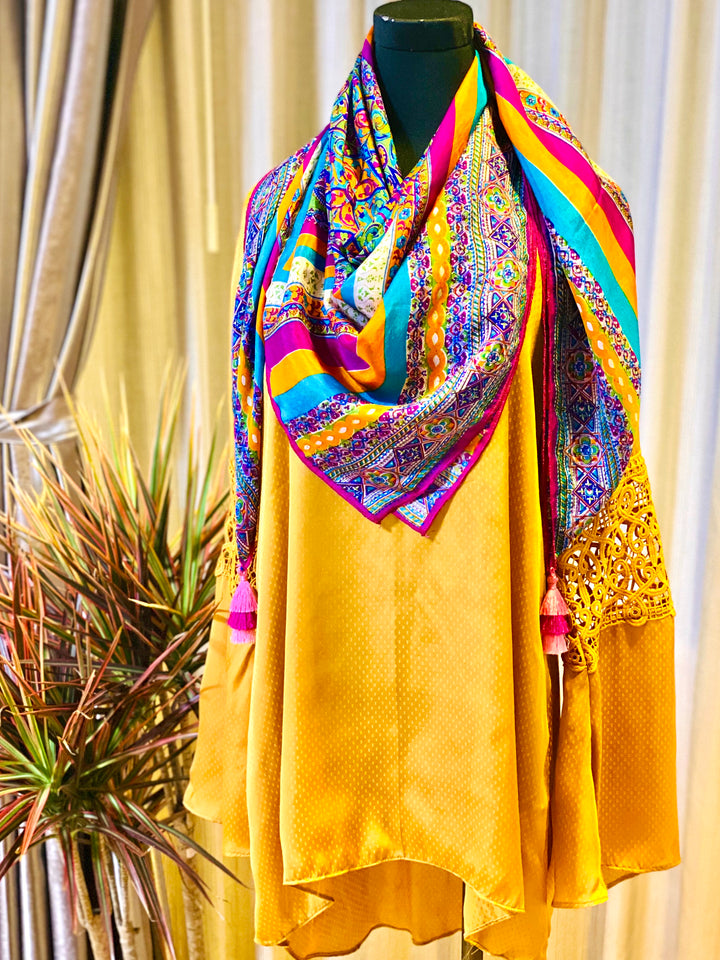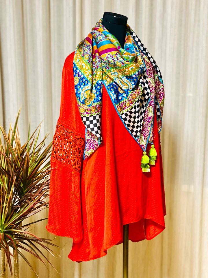 Pretty silk tops and handcrafted lacing on sleeves in self colours paired with pretty chic scarves from our boho collection.
