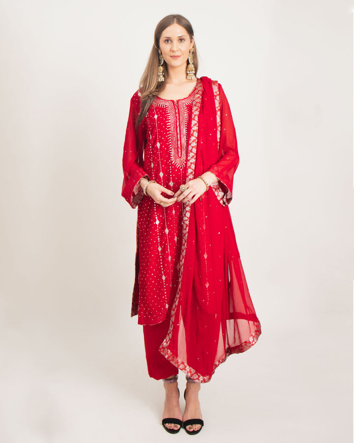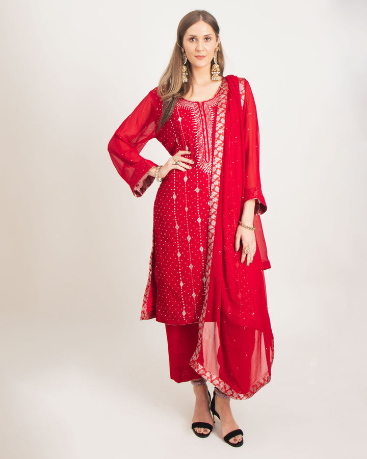 Elevate your wardrobe with this stunning 3-piece chiffon desi suit, adorned with silver Mukesh work on the front bodice and sleeves accompanied by a dupatta with banarsi fusion to accentuate the beauty.