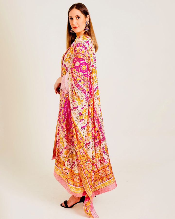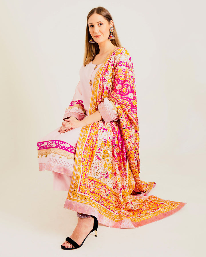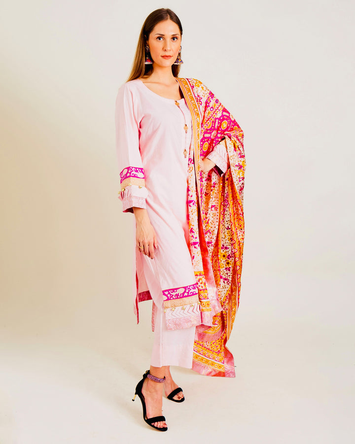 Pure & Premium Cotton Fabric Powder Pink outfit. The neckline is embellished with fancy stoned buttons. The sleeves and daman are crafted with silk patching and golden balls finished with rose pink jamawar for a soft festive look.