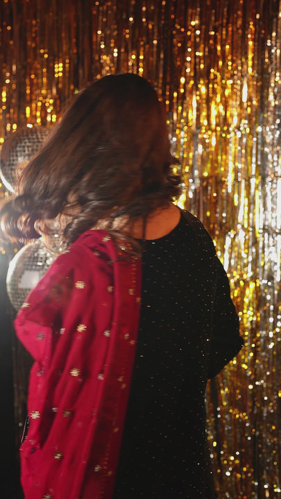 Bold and striking, Revel Noir is a formal velvet ensemble designed to make a statement. The short velvet shirt is adorned with kohra dabka statement motifs, blended with coloured appliqué detailing and accented with gold and silver sitaras, creating depth and rich texture.