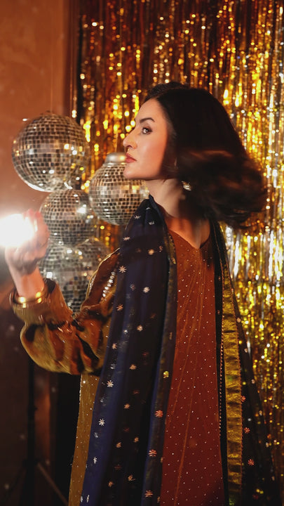 Paired with velvet culotte trousers featuring foil work and gold-threaded scalloped borders, the silhouette feels structured yet refined. The look is completed with a flowy chiffon dupatta, detailed with multicolour sitara boti work and finished with scalloped borders, Jamawar, and gotta, adding movement and grandeur.