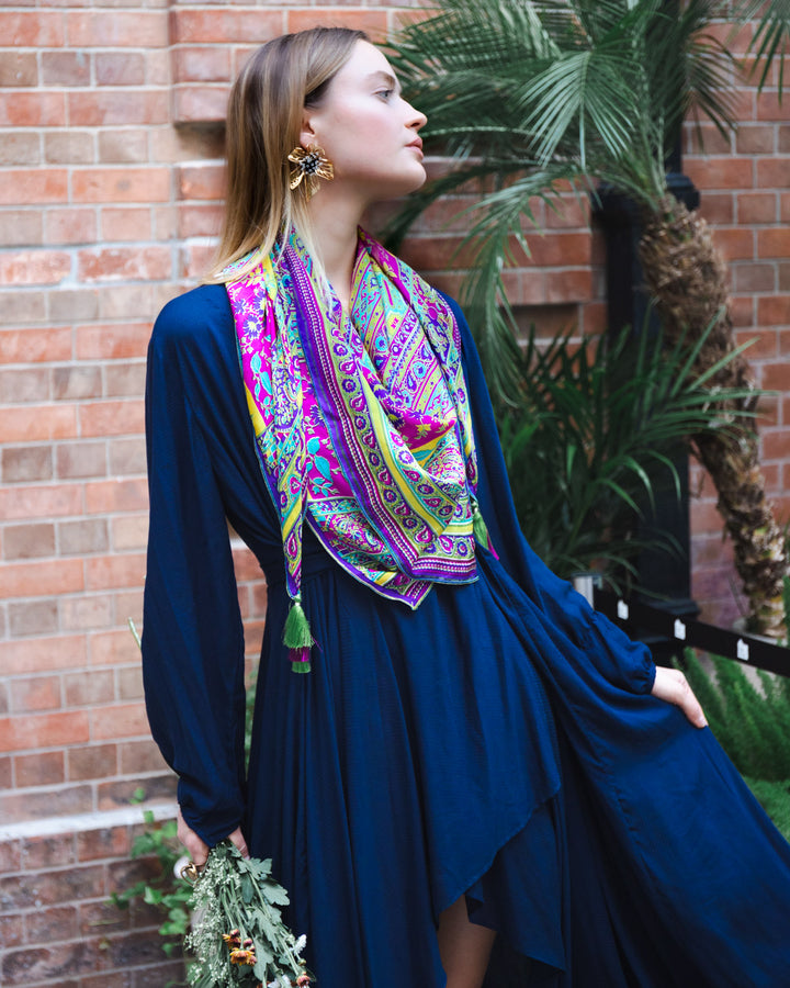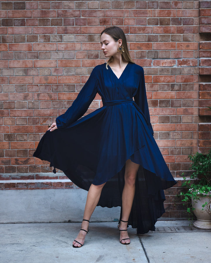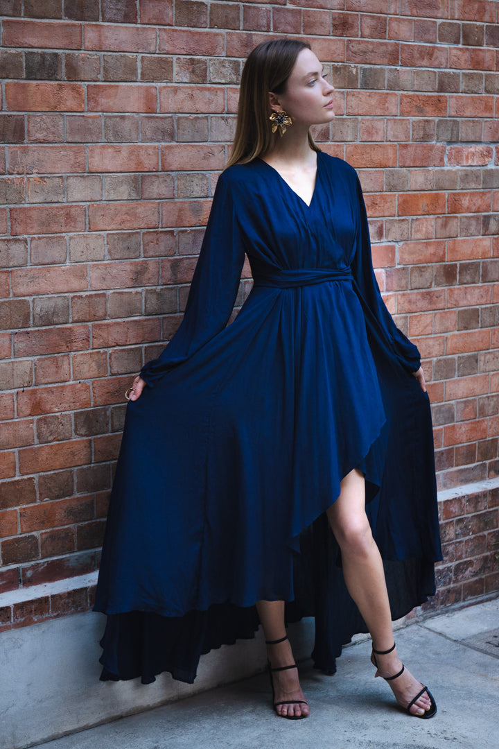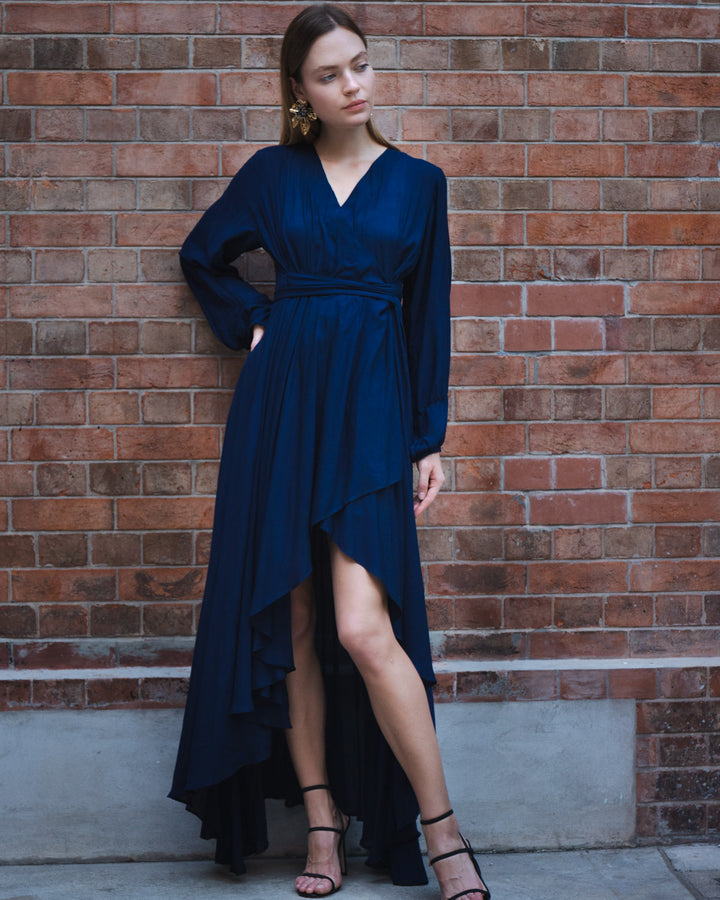 The richness and depth of the charismatic shade of navy blue are witnessed in this gorgeous gown . The short flared front, lengthy flared back, and V-neck is bound to dredge your whole personality in the charismatic fashion fountain.