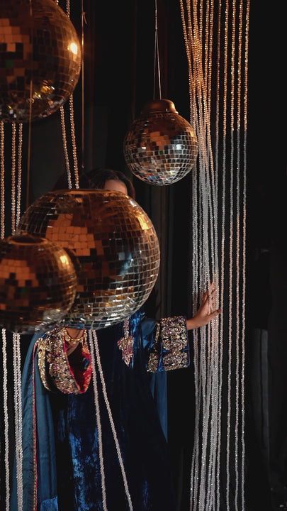 Paired with chaumese tussel culotte trousers, the silhouette remains fluid and elegant, allowing the craftsmanship to take center stage. The ensemble is completed with a flowy chiffon dupatta, detailed with oxidized sitara borders on all four sides and finished with Jamawar and velvet accents, adding depth and ceremonial elegance.