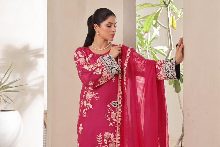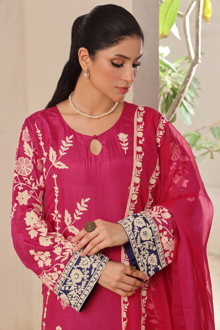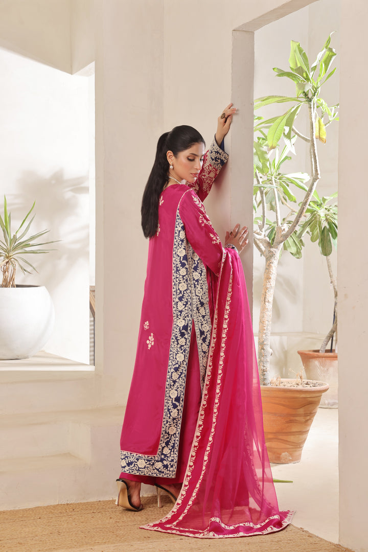 This elegant ensemble features a shirt and trouser crafted from luxurious Sheesha silk, known for its rich texture and subtle sheen. The soft organza dupatta adds a delicate, airy contrast, enhancing the outfit’s sophistication. Expertly designed with intricate ari thread work on color block patching, the craftsmanship highlights traditional artistry with a contemporary twist, making it a refined choice for special occasions.