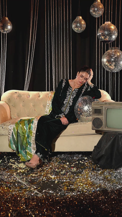 Refined and elegant, Viva Forest is a semi-formal velvet ensemble designed for elevated evenings. The velvet shirt features silver and thread floral work across the neckline, shoulders, and sleeves, creating a graceful focal point. The back is finished with a coloured appliqué motif highlighted with silver detailing, adding depth and subtle drama.