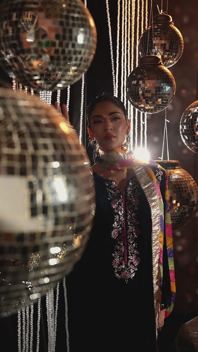 Refined and elegant, Viva Lagoon is a semi-formal velvet ensemble designed for elevated evenings. The velvet shirt features silver and thread floral work across the neckline, shoulders, and sleeves, creating a graceful focal point. The back is finished with a coloured appliqué motif highlighted with silver detailing, adding depth and subtle drama.