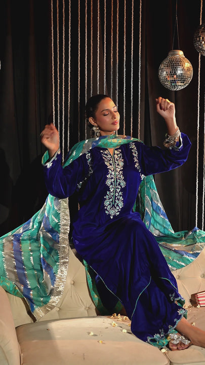 Refined and elegant, Viva Regal is a semi-formal velvet ensemble designed for elevated evenings. The velvet shirt features silver and thread floral work across the neckline, shoulders, and sleeves, creating a graceful focal point. The back is finished with a coloured appliqué motif highlighted with silver detailing, adding depth and subtle drama.
