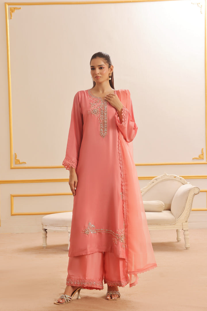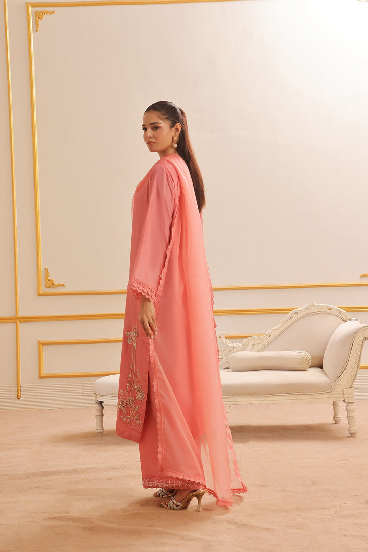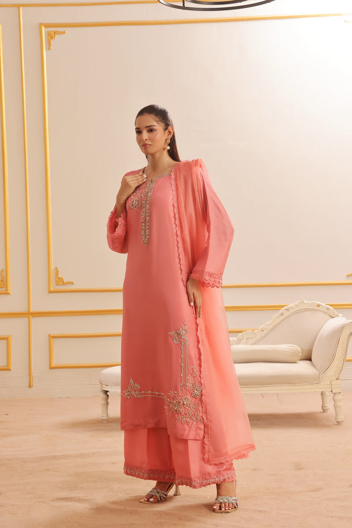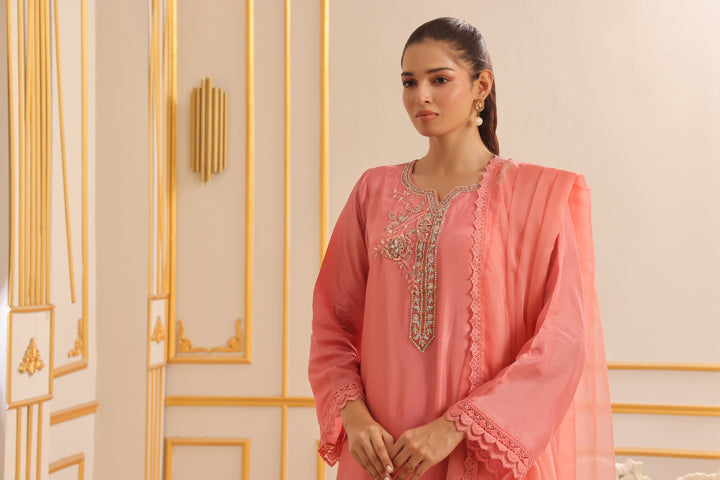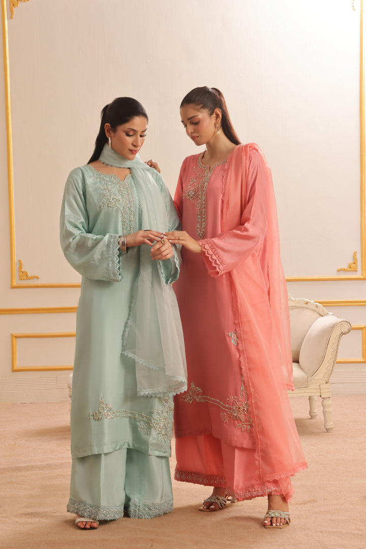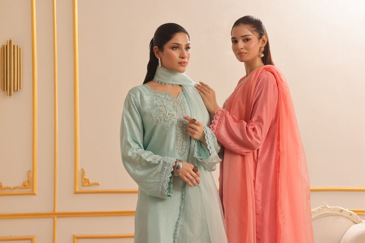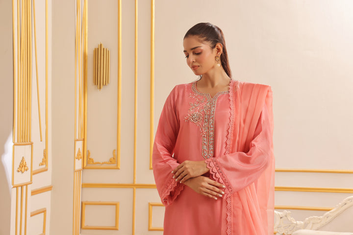 The Zorya three-piece suit features a sheesha silk organza dupatta and trousers adorned with delicate lacing and intricate work. The dupatta is elegantly finished with matching lacing, complementing the shirt’s neckline and daman, which are embellished with rhinestone-cut Dana 3D embroidery. This ensemble combines traditional artistry with modern sophistication and can be customized in any color to suit your personal style.